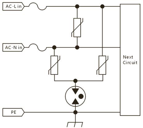 下圖為電源口典型的三加一電路,三顆壓敏加一顆氣體放電管: